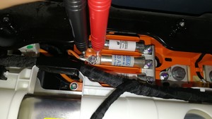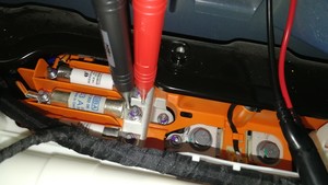 使用 Hioki 电阻表测量空调压缩机保险丝与正极直流母排之间高压连接点的电阻。