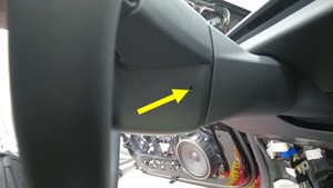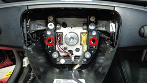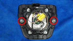 按压 2 个检修孔上的弹簧夹(2 个),将驾驶位气囊从方向盘上松开,然后将气囊部分拉离方向盘。