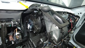 - 将 HVAC 模块向后移动,然后在车身和 HVAC 模块之间插入一个充气气囊,为拆卸和安装鼓风电机留出足够空间。