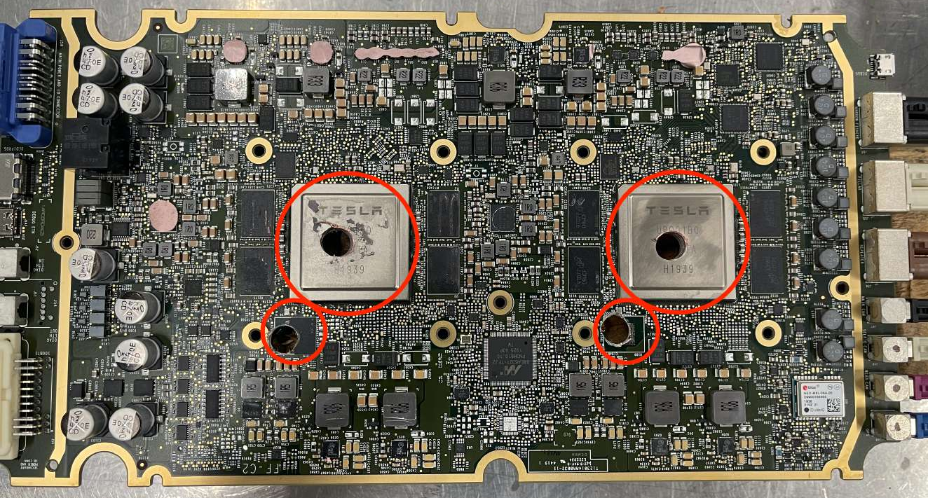 翻转 APE 印刷电路板总成 (PCBA) 板,然后使用 8 毫米钻头在 APE CPU 和 UFS 芯片上钻孔(4 个).