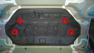 - 松开将后电机舱降噪衬垫固定到车辆的卡子(4 个),然后拆下后电机舱降噪衬垫。