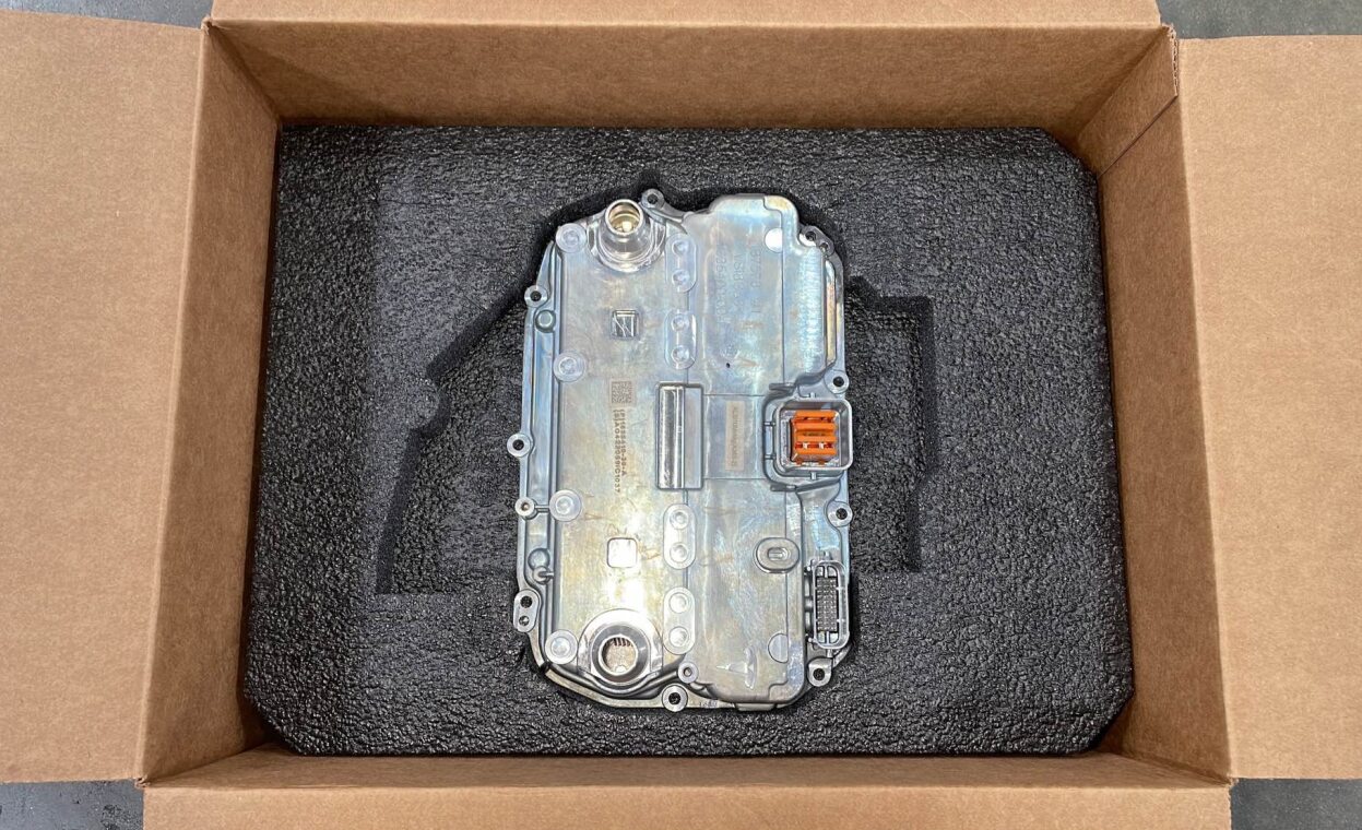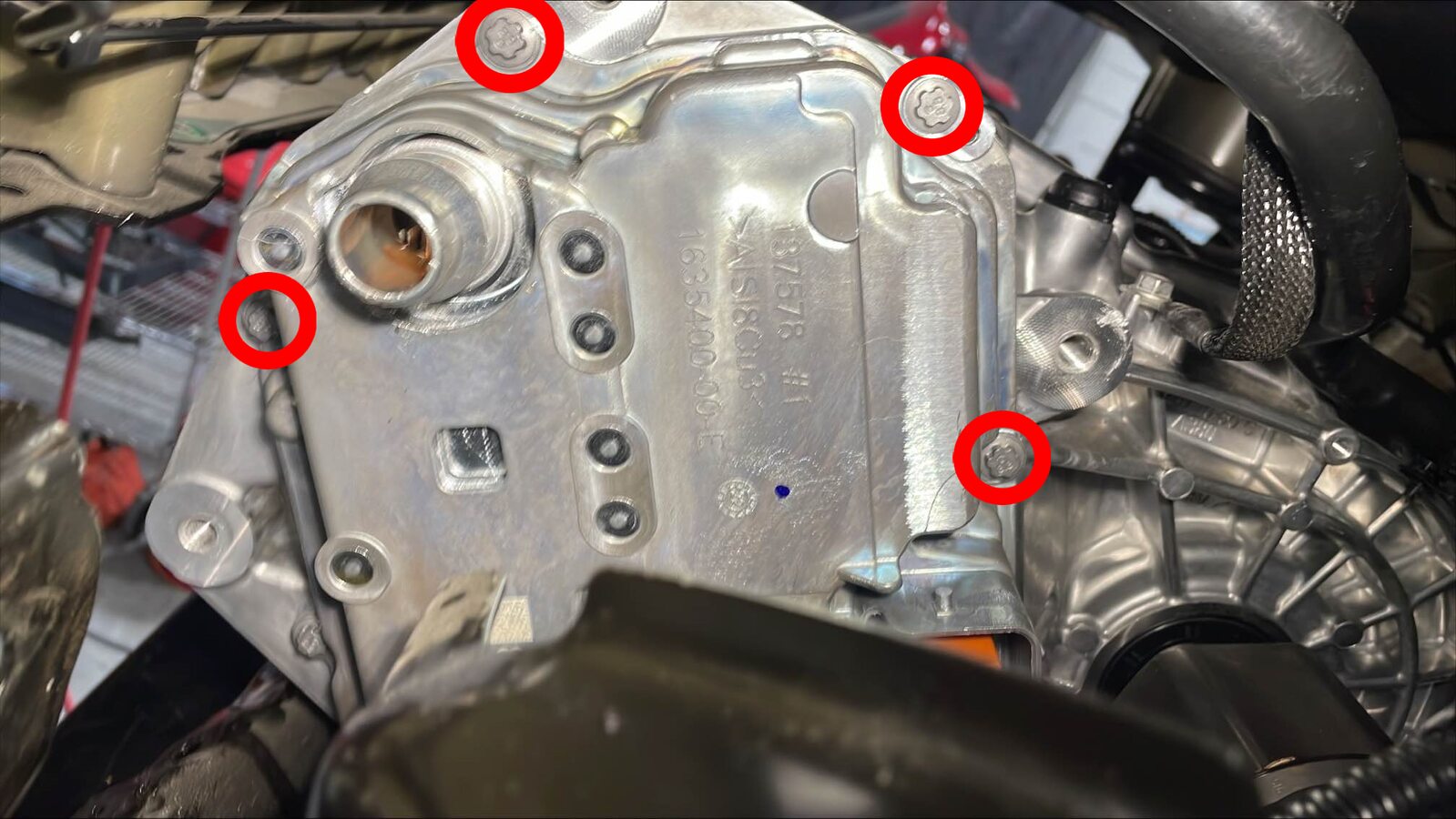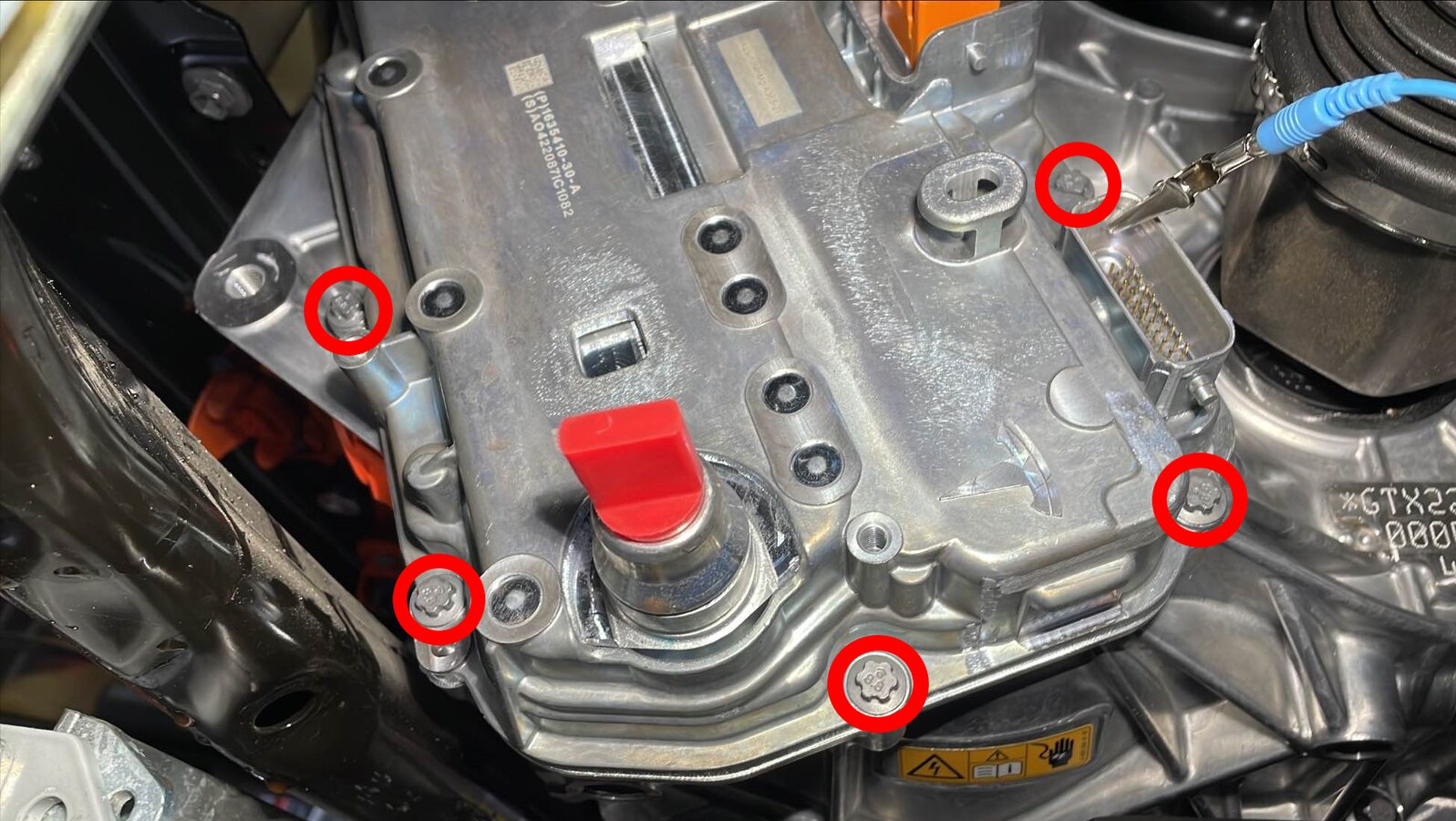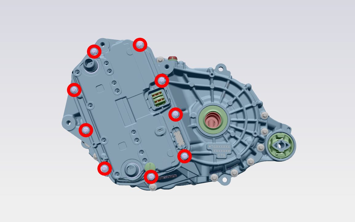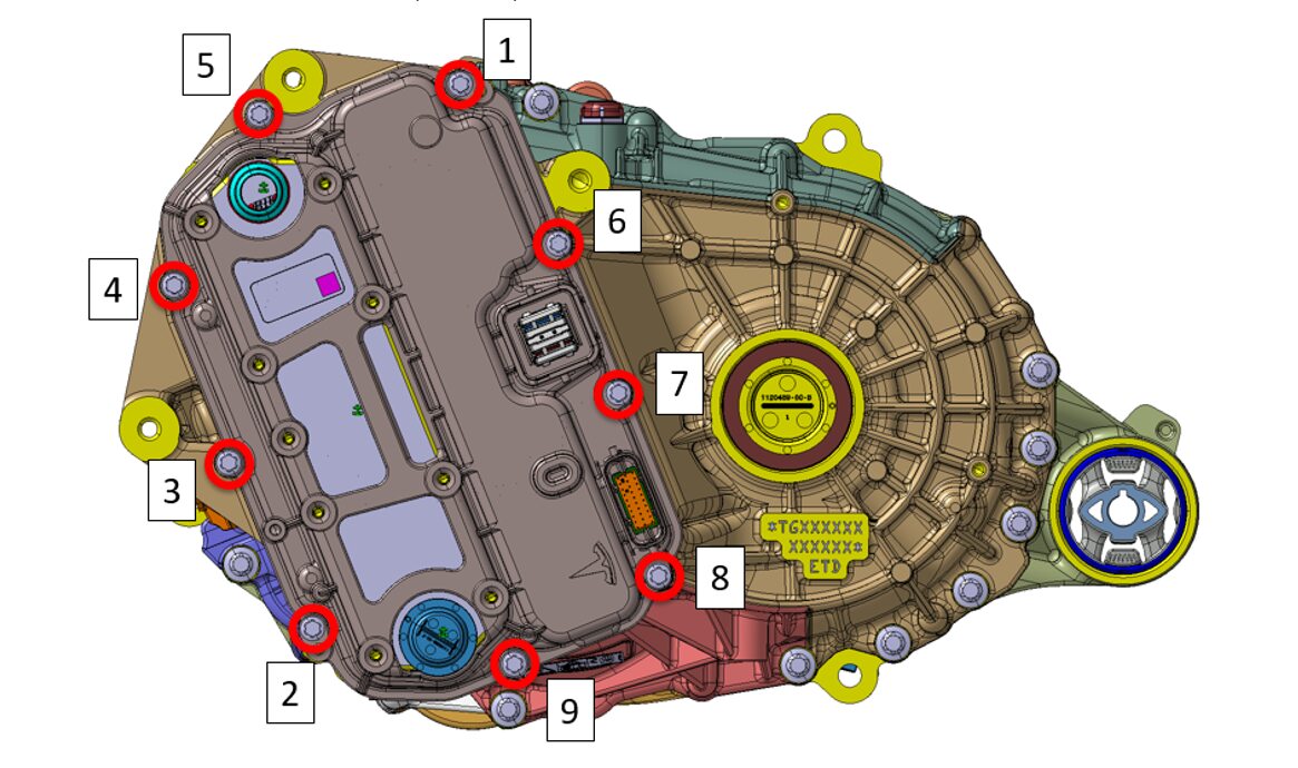 - 安装并手动拧紧将新后驱动单元变流器固定到后驱动单元左侧变速箱的新螺栓(9 个)(1100020-00-A 或更新版本)。