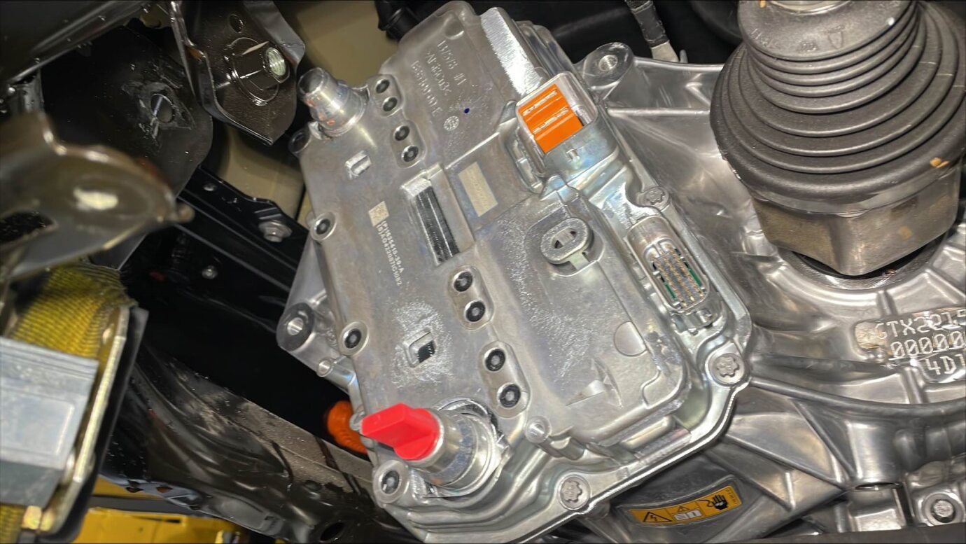 小心地将后驱动单元变流器从后驱动单元变速箱上拆下,然后向下移动变流器,并将其从后副车架与驱动单元之间移出。