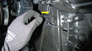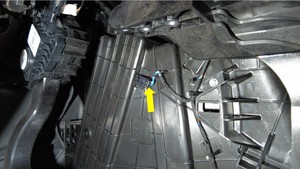 松开将蒸发器热敏电阻固定到暖通空调总成的卡子,然后将蒸发器热敏电阻直接拉离 HVAC 总成。