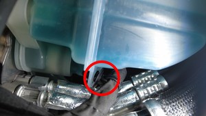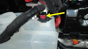 在冷却液罐附近,将电气连接器连接到动力总成供给软管传感器。