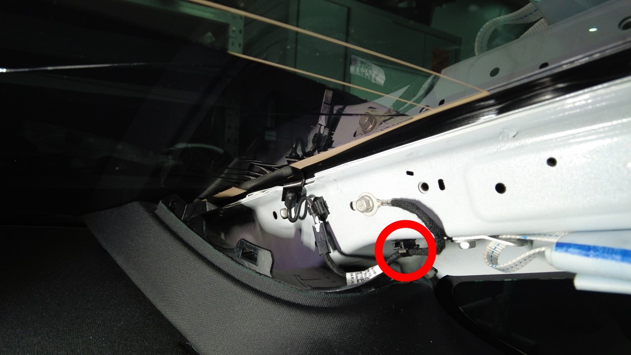 - 将左侧天线滤波器线束连接器从左侧 C 柱接地线上断开。