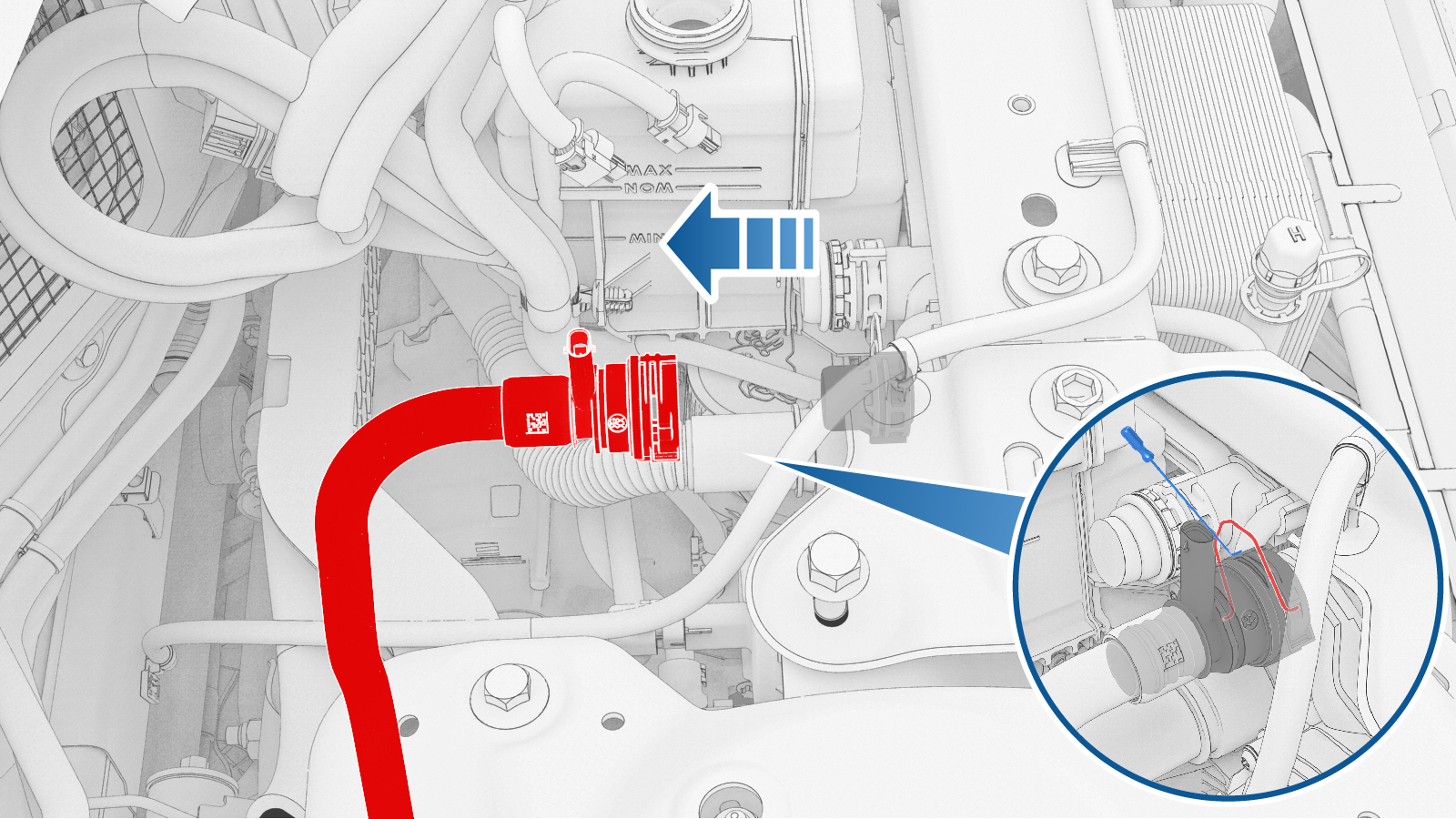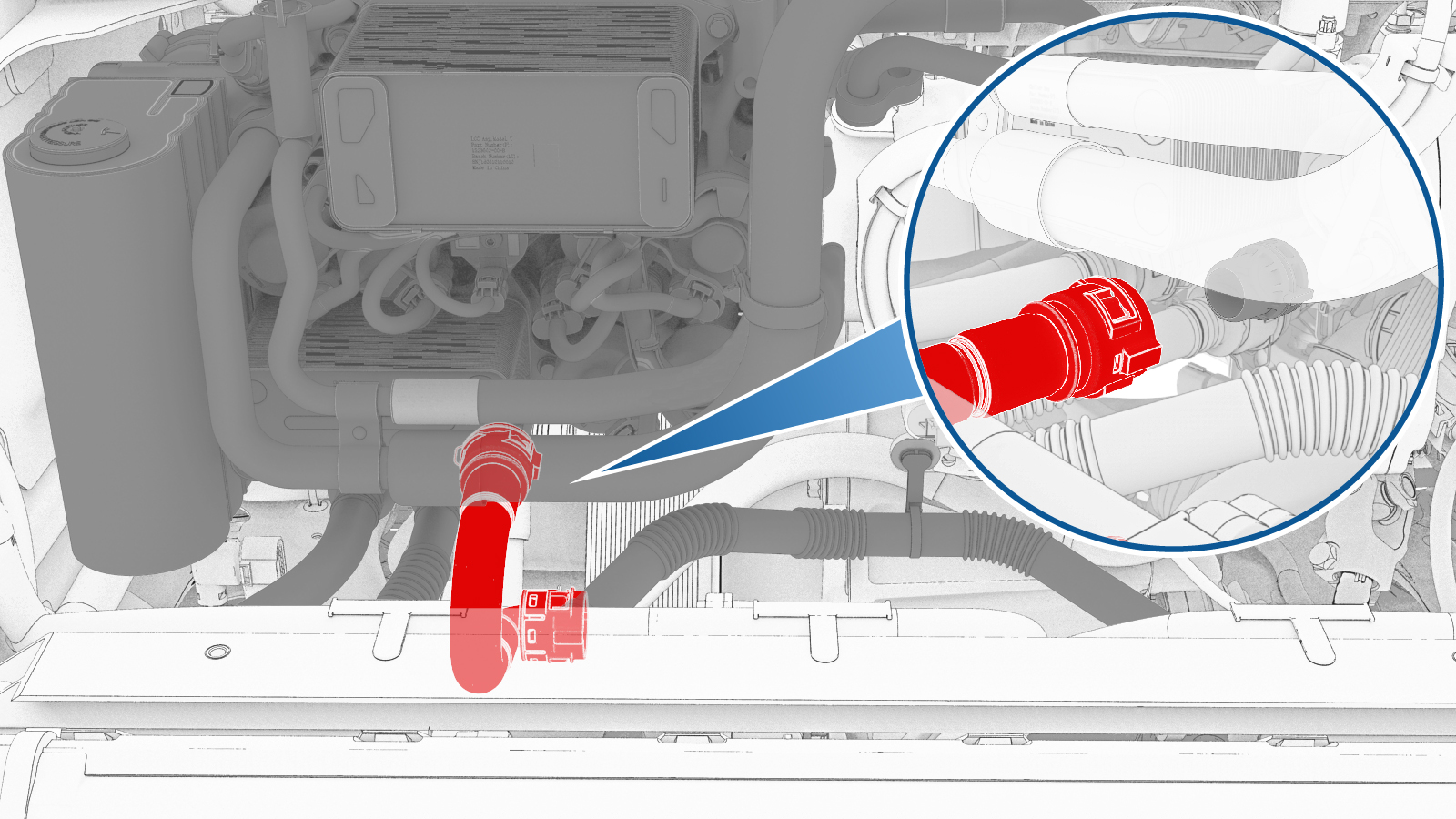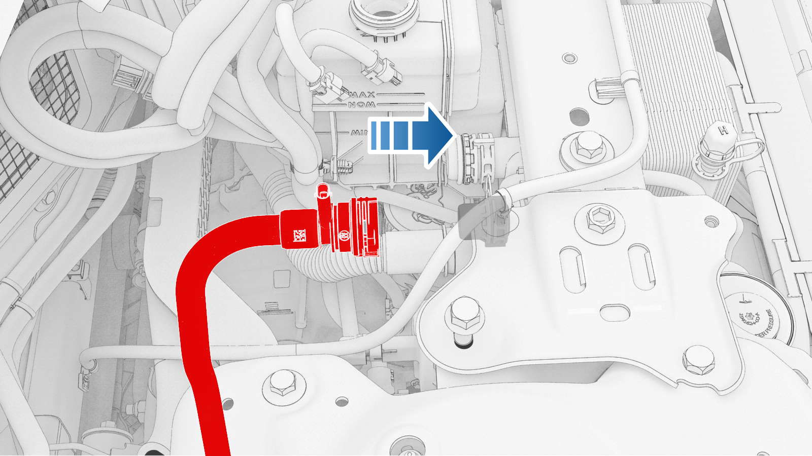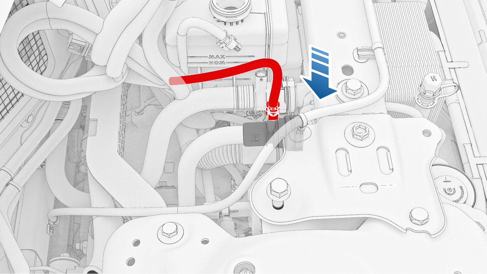 - 松开弹簧夹,将散热器出口软管从超级歧管上断开,然后堵住软管和超级歧管。
