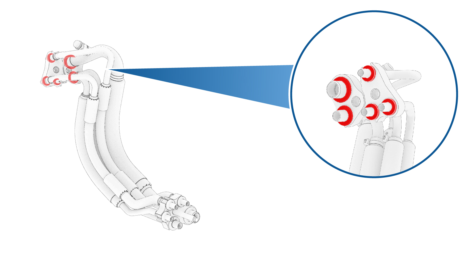 更换超级歧管至暖通空调管路总成上超级歧管一侧的密封垫圈(5 个)。