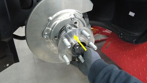 - 对齐左前驱动单元半轴花键,然后将左前轮毂安装到左前转向节上。
