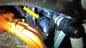 - Use a clip prytool to release the clip that attaches the front drive unit inverter inlet hose to the front drive unit.