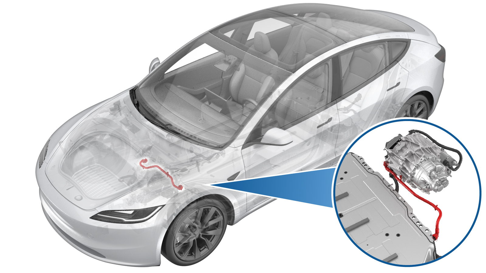 - Install the clip that attaches the front drive unit inverter inlet hose to the front subframe.