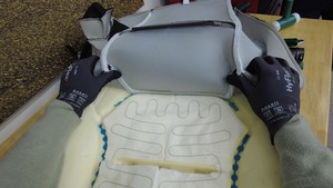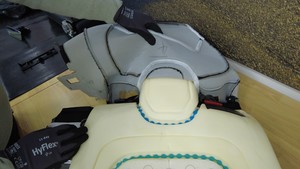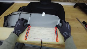 - 将座椅安全带穿过蒙皮罩,然后将饰板罩从泡沫垫上拆下。