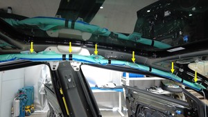 小心松开将左侧安全气帘固定到纵梁的卡子(8 个),然后将气囊从车上拆下。