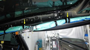 将左侧安全气帘安装到纵梁上,然后小心紧固将气囊固定到纵梁的卡子(8 个)。