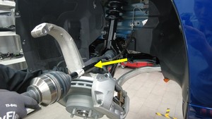 在协助下,从左前轮毂总成上拆下左前驱动单元半轴,然后将半轴置于一旁。