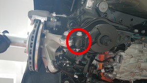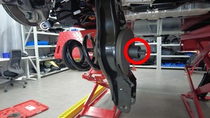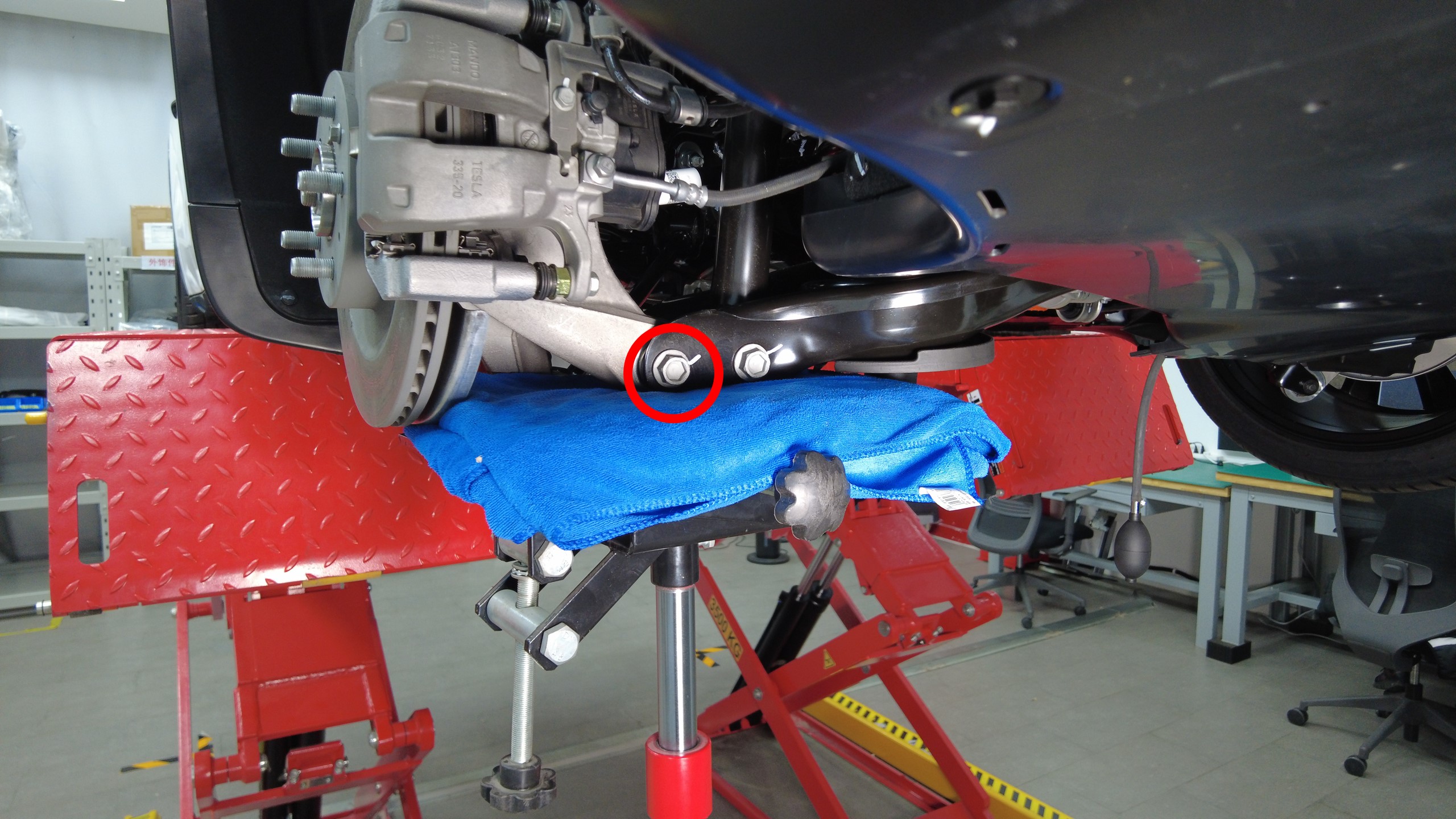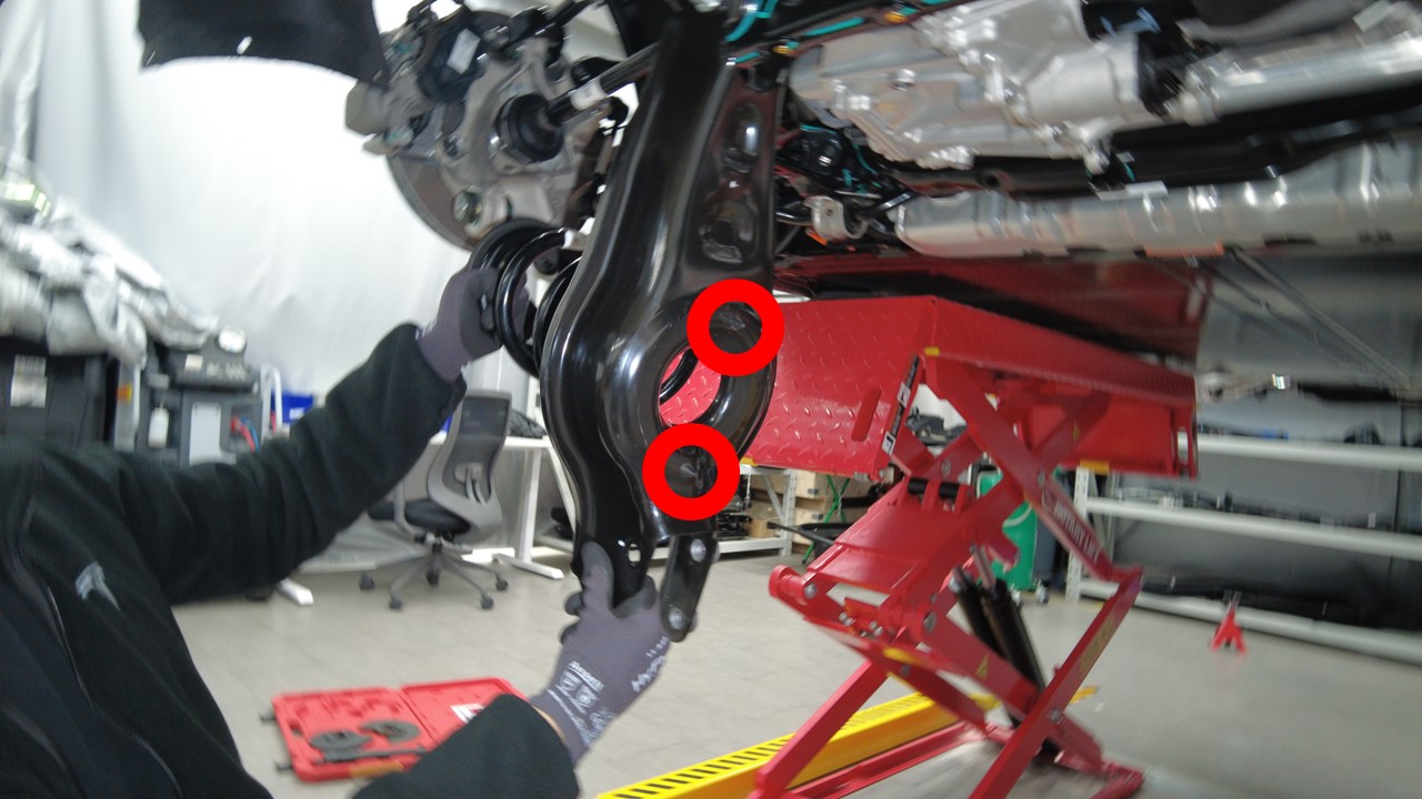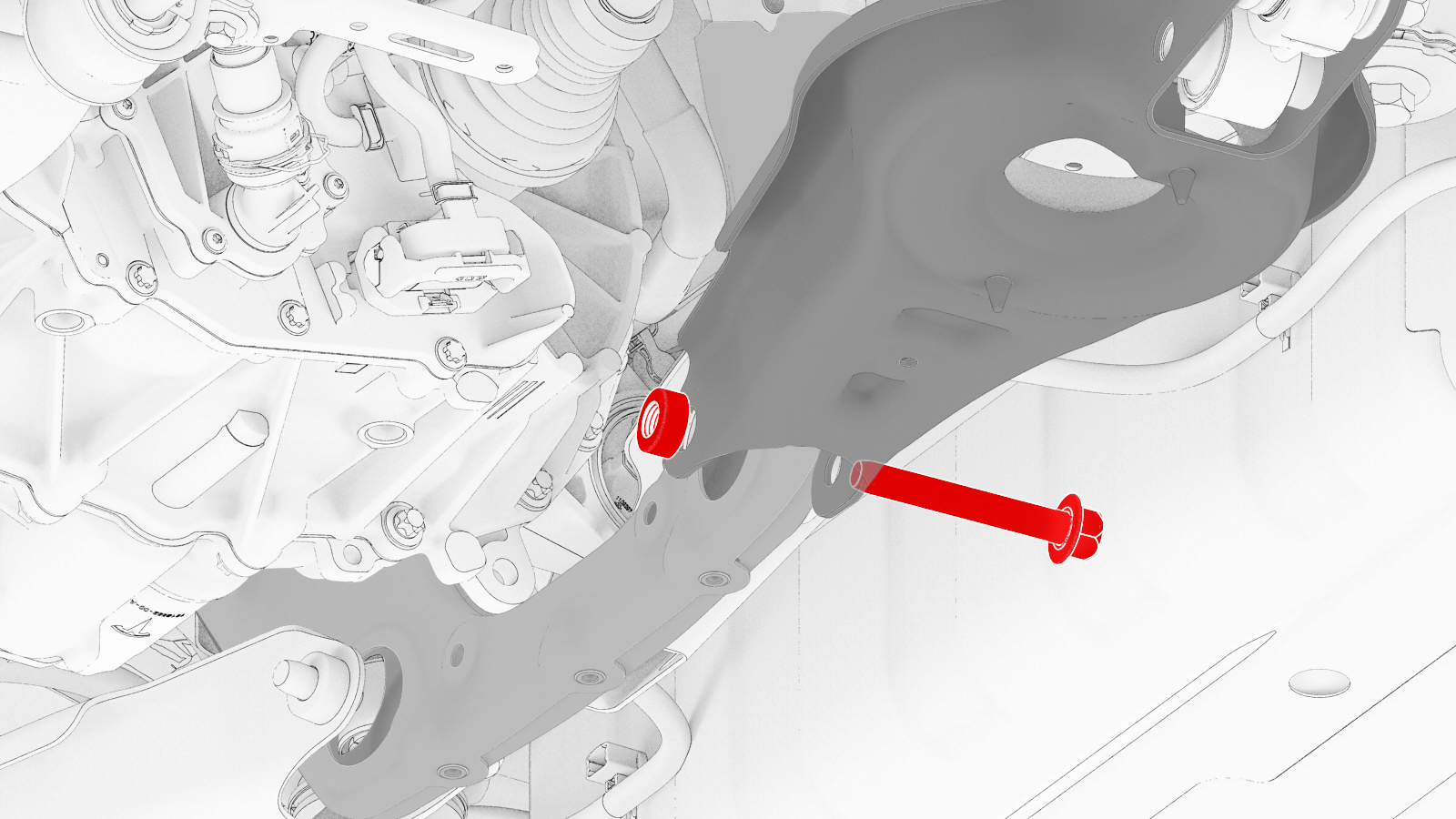 - 手动拧紧将左后减震器固定到左后下尾连杆的螺栓和螺母。