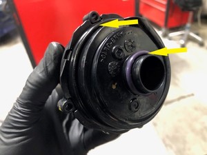 注确保两个 O 型环(内侧紫色和外侧黑色)随旧泵一起脱离。