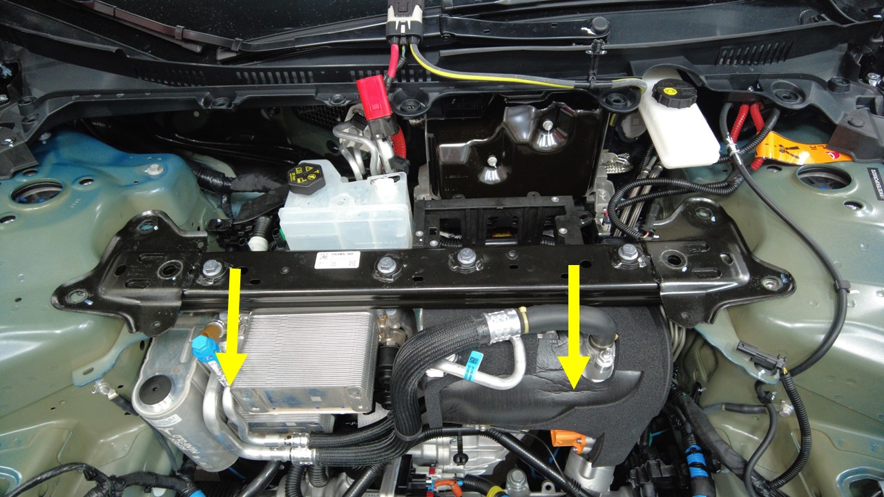 - 在接地带连接点附近,安装将冷却液软管固定到空调压缩机支架的卡子。