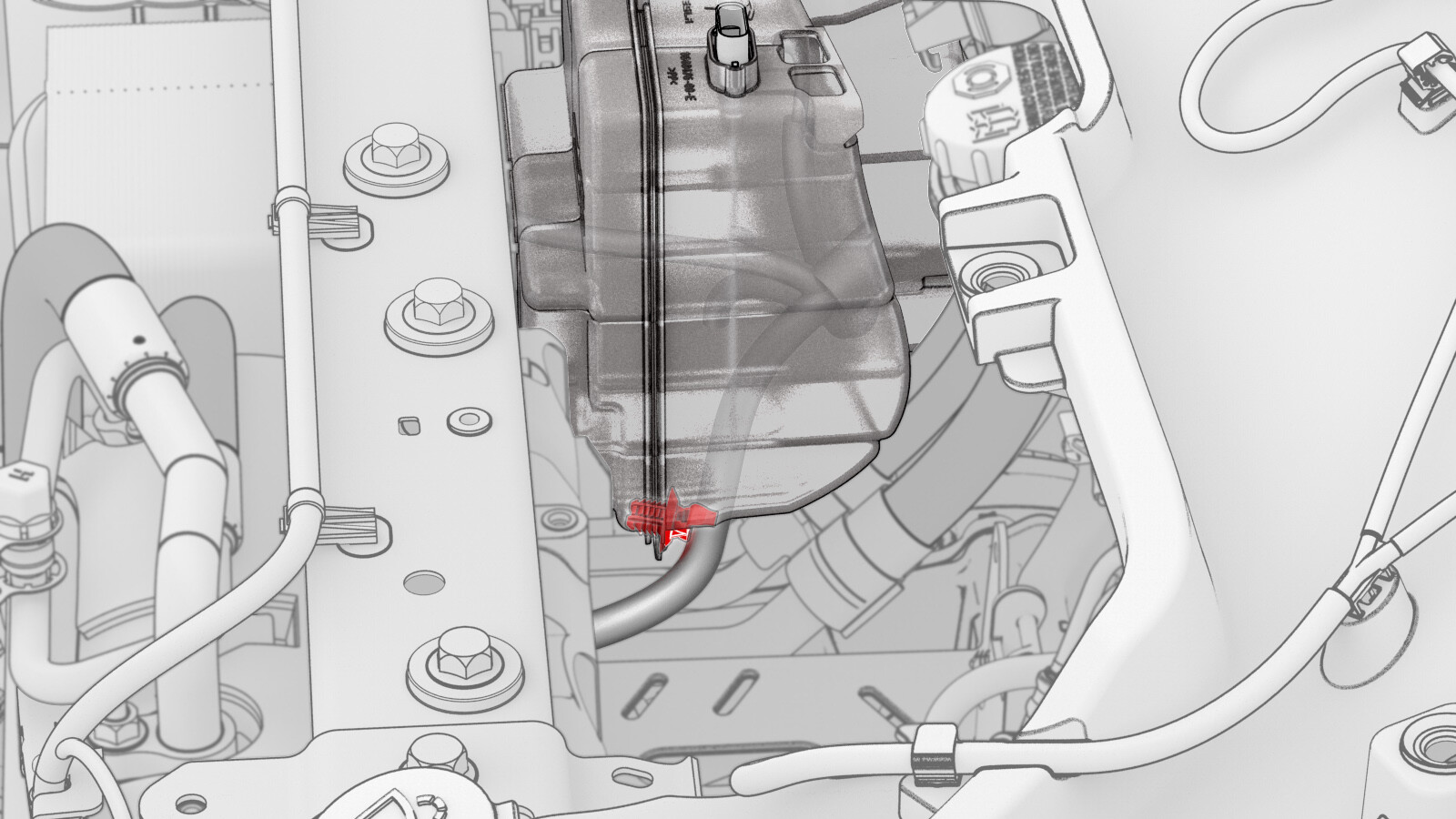 - 安装将电气线束固定到冷却液罐下部左侧的夹子。