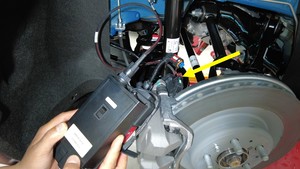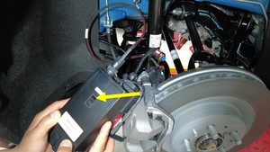 - 按下电子驻车制动释放工具上的释放按钮,释放左后驻车制动。