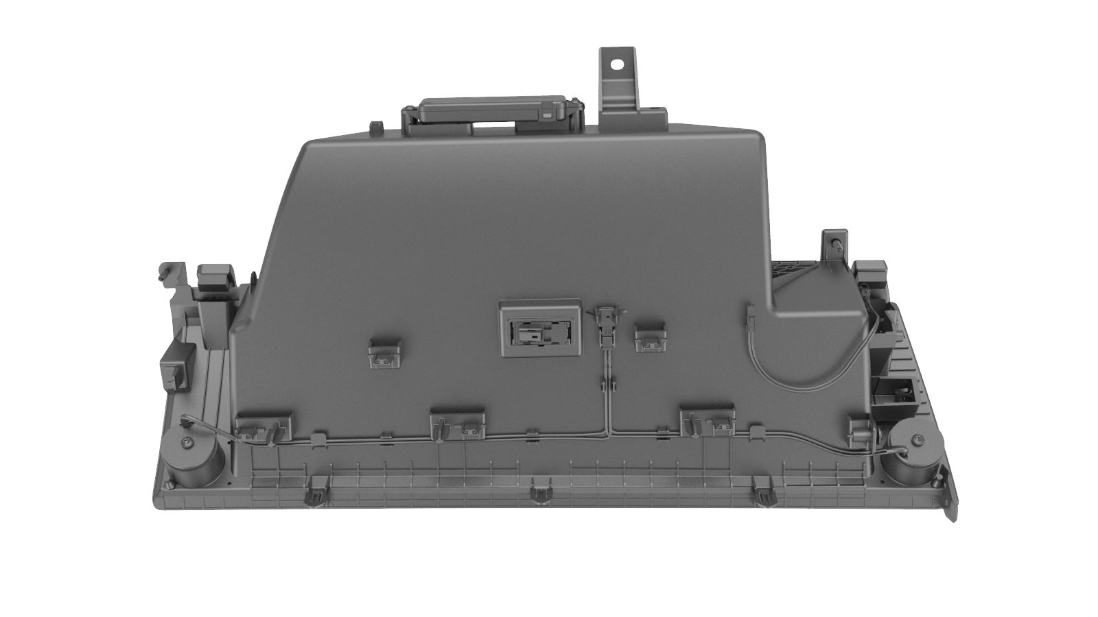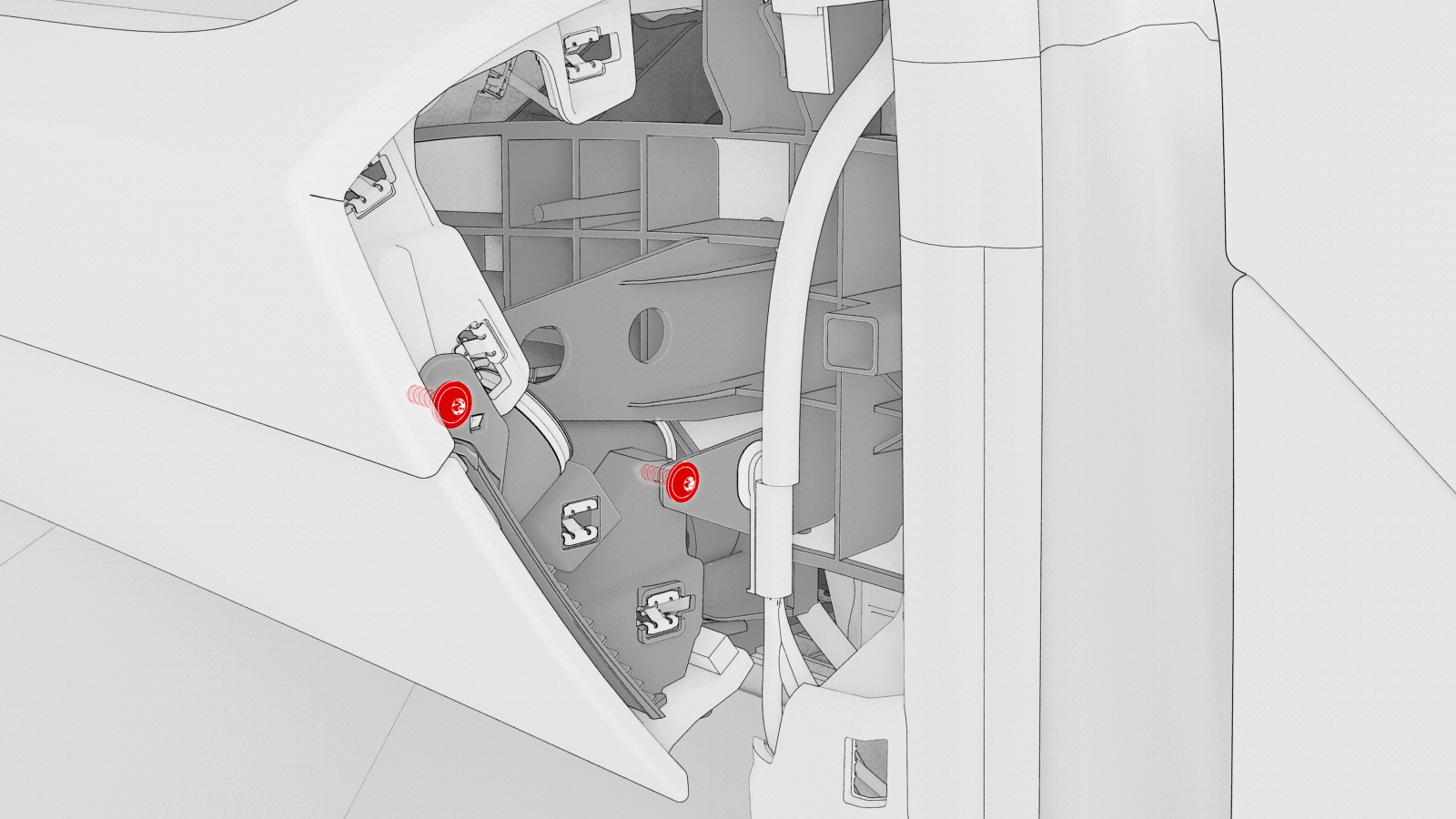 - 紧固将手套箱固定到仪表板支架的卡子(10 个)、定位销(3 个)和固定销。