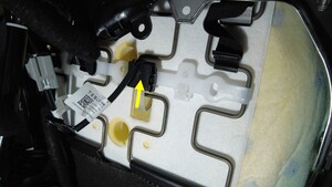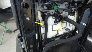 - 拆卸将线束固定到左前座椅底部的夹子(位于座垫加热器连接器旁)。