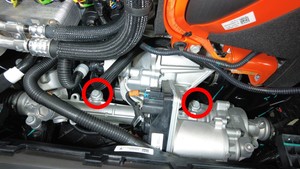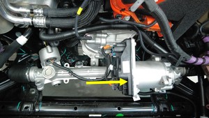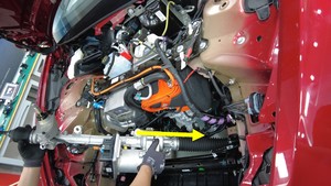 - 将转向机构总成左侧放置到前备箱储物区,然后将右侧滑入车辆。放置转向齿条,注意对齐螺栓孔。