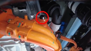- 松开卡子,将高压电池右侧内部回流软管从高压电池右后侧断开,然后立即堵住两个接头。