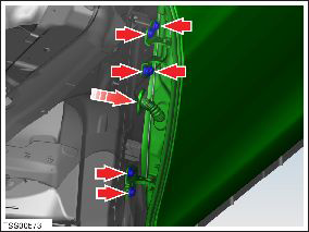 Remove the bolts (x6) that secures the door hinges to body (torque 31 Nm).