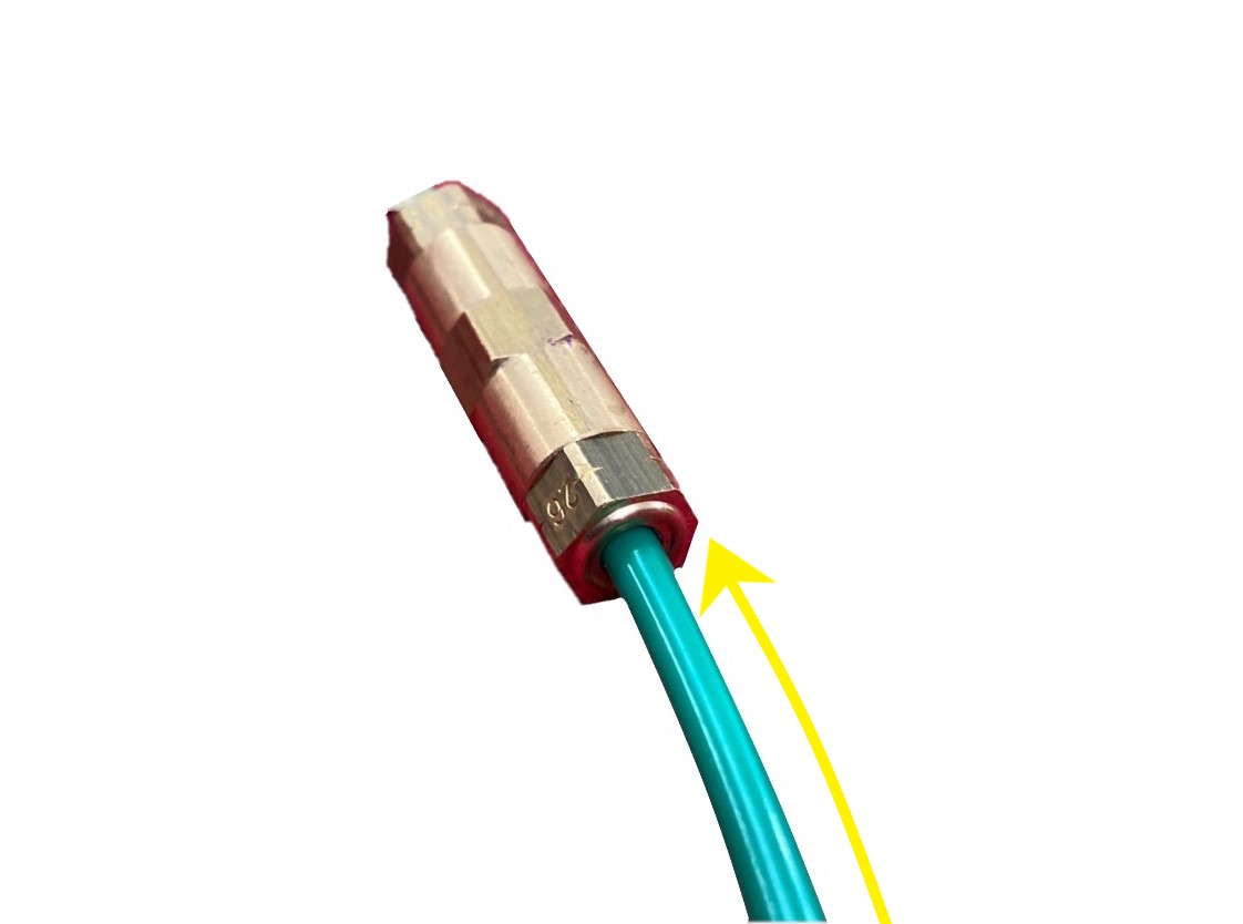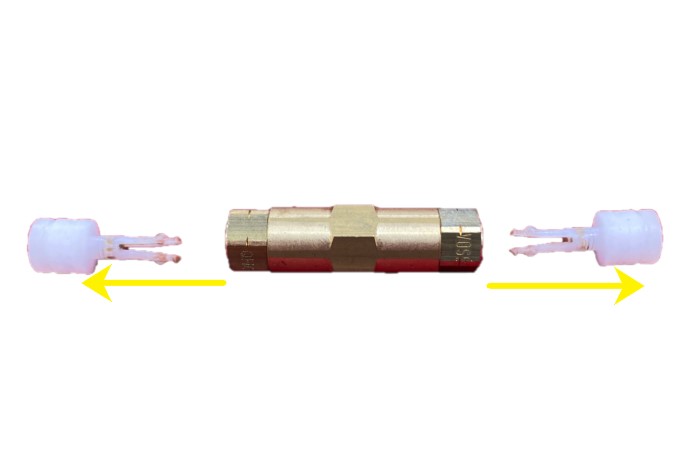 - Insert the air line fully into the fitting on each side of the brass VOSS union, and then lightly pull on the lines to make sure they are secured.