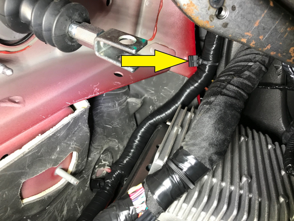 - Release the fir tree clip that attaches the electrical harness to the cross car beam, and then move the electrical harness to the side.