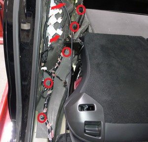 - Release the bolt (torque 10 Nm) and clips (x5) that attach the RH body harness to the RH quarter panel area.