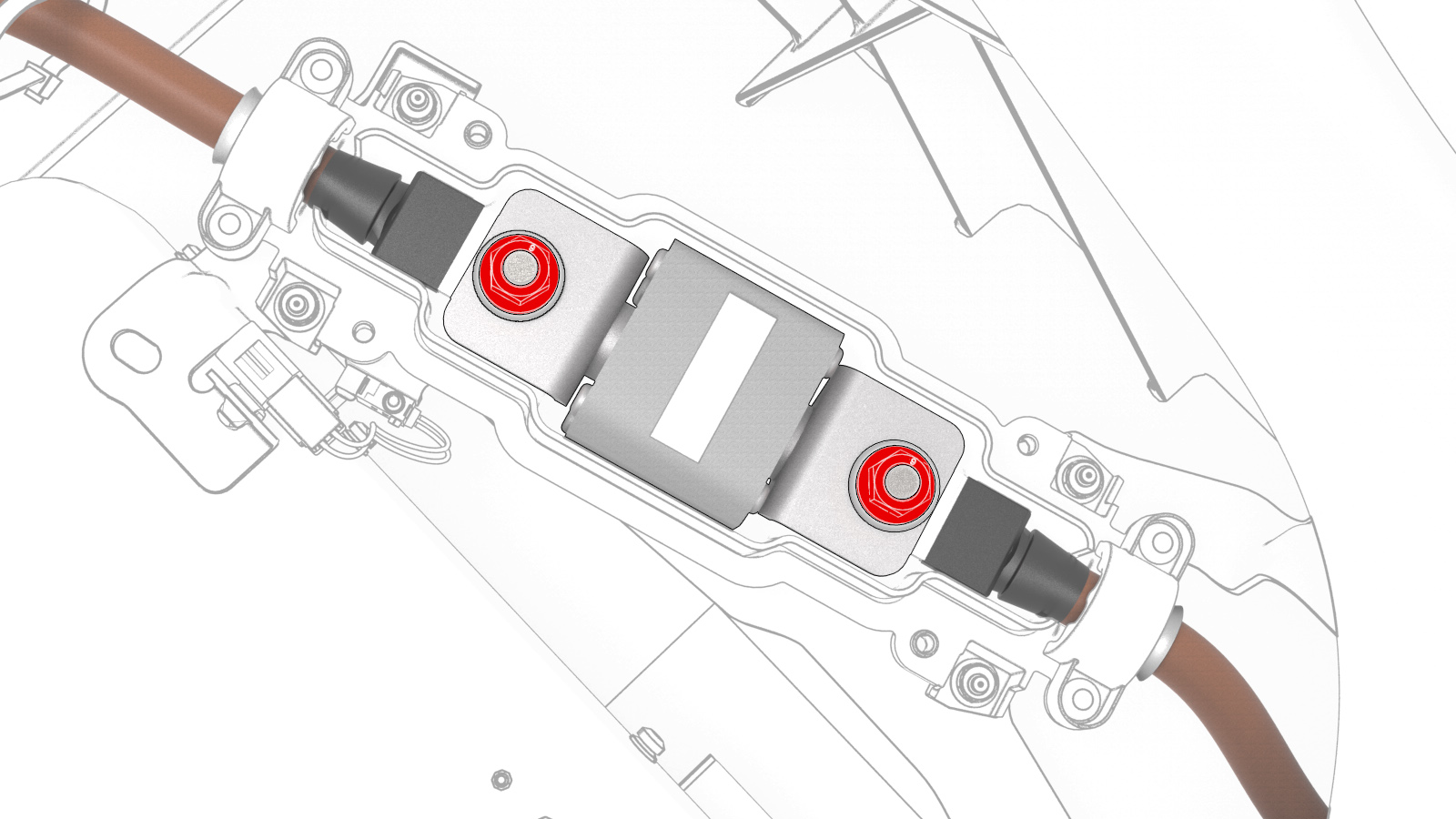 - Remove the nuts (x2) that attach the inline fuse to the front drive unit HV harness.