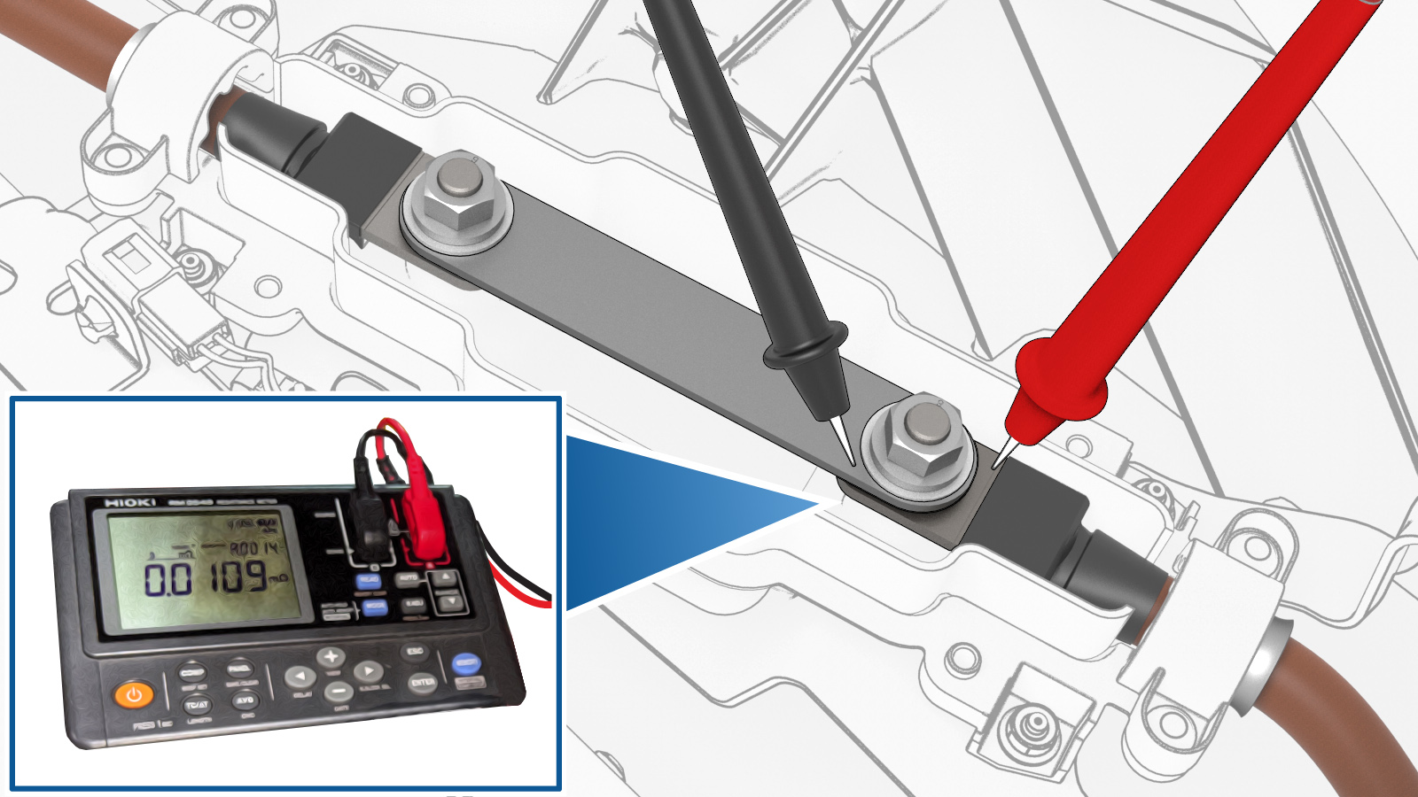 NoteThe acceptable resistance is between 0.050 mΩ (50 μΩ) and 0.150 mΩ (150 μΩ). If the resistance is not within this range, reposition the probes and measure again. If the resistance is repeatedly between 0.00 mΩ and 0.050 mΩ (50 μΩ), the Hioki test passed, proceed with the installation procedure. For more information on Hioki resistance testing, refer to Toolbox article 218200.