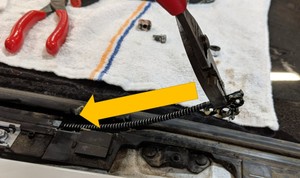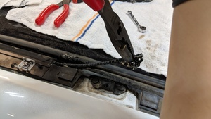 - Slide the panoramic roof rear left link back, past the frame channel.