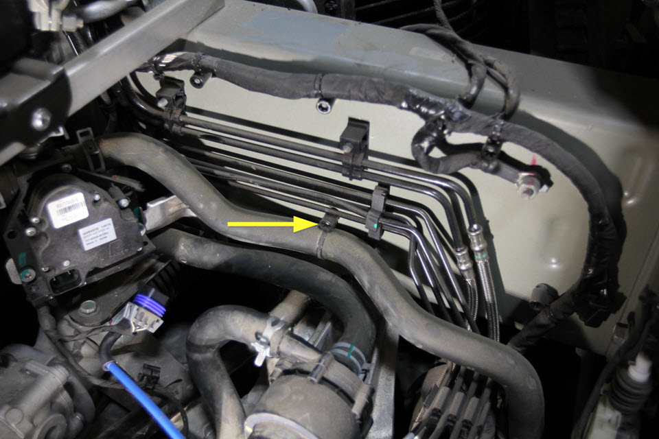 - Install the clip that attaches the coolant hose to the LH side of the frame rail.