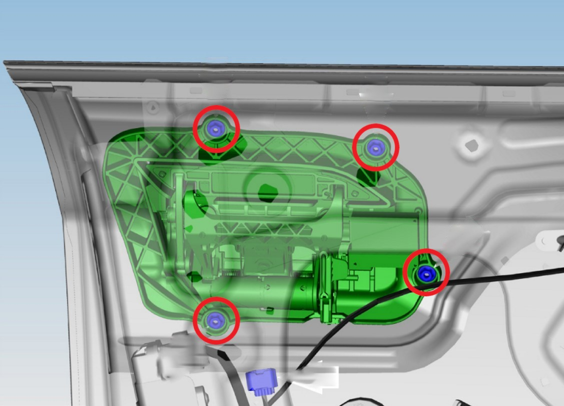 - Remove the rear lower access cover for the LH rear lower window regulator nu. and then remove the lower rear nut that attaches the LH rear regulator assembly (torque 7.5 Nm).