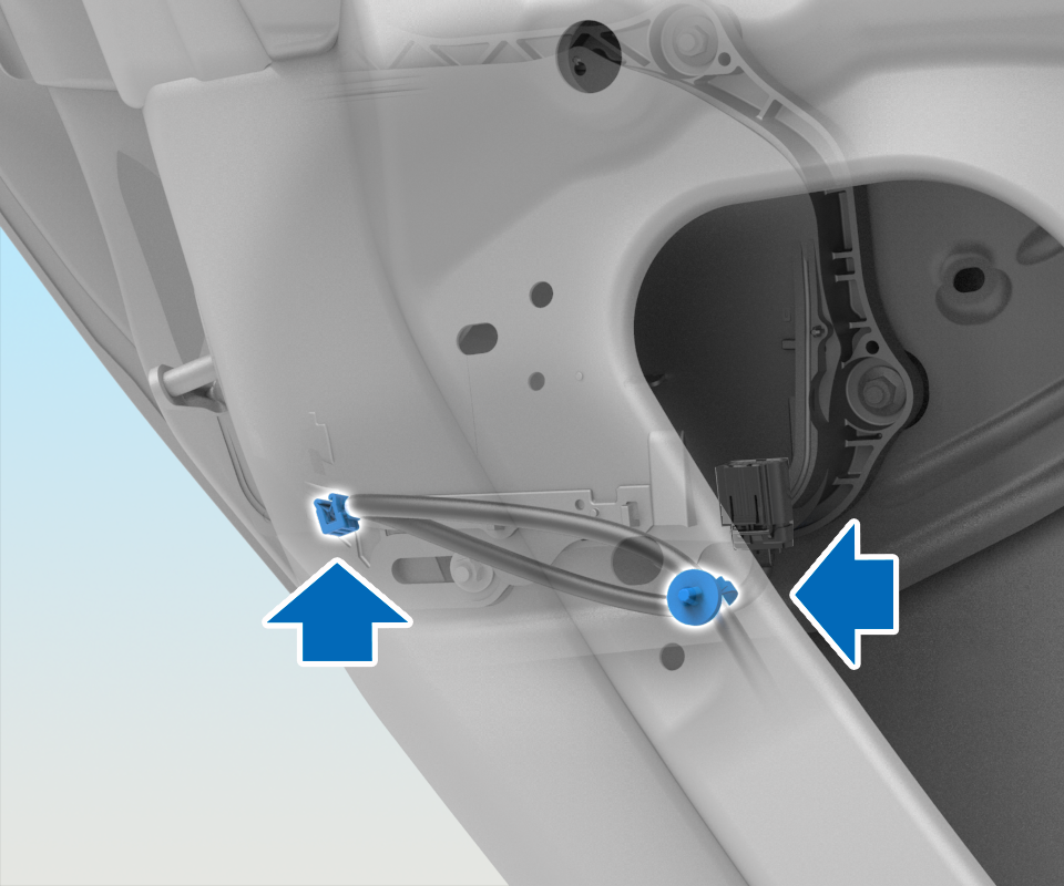 - Attach the door handle wiring harness to the inner door frame with a push clip and attach the door handle wiring harness clip to the door.