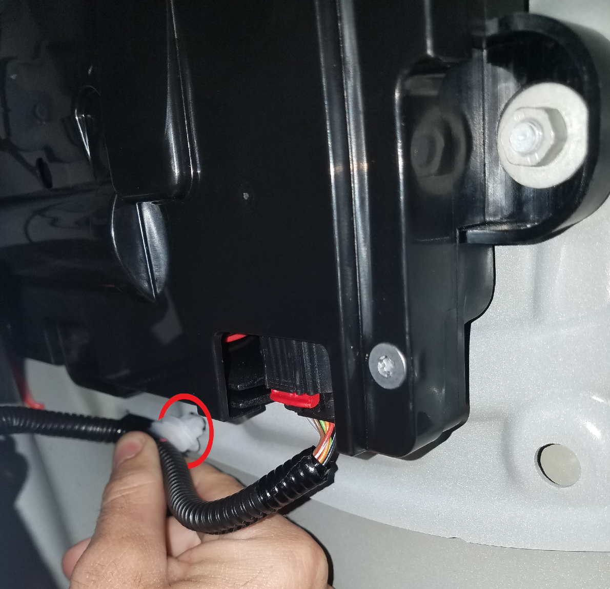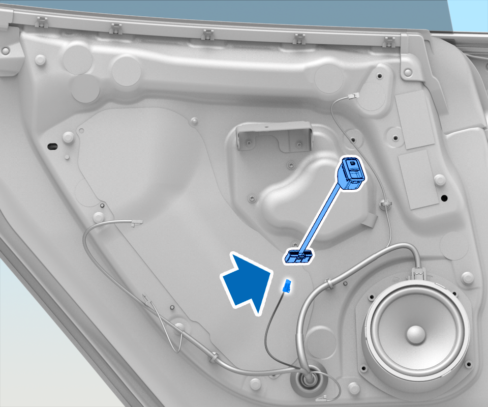 - Using a pry tool, remove the fir tree clip that attaches the door handle harness inside the door cavity, and then disconnect the LH rear door handle connector.