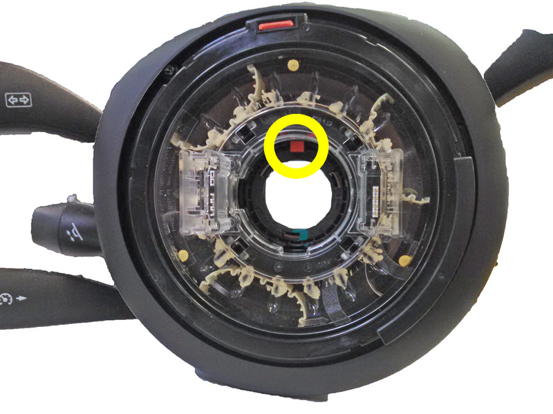 - Press up on the red tab to adjust the position of the plastic housing. Rotate the housing until the clocksping cable is between the arrows and the tab returns to the locked position.
