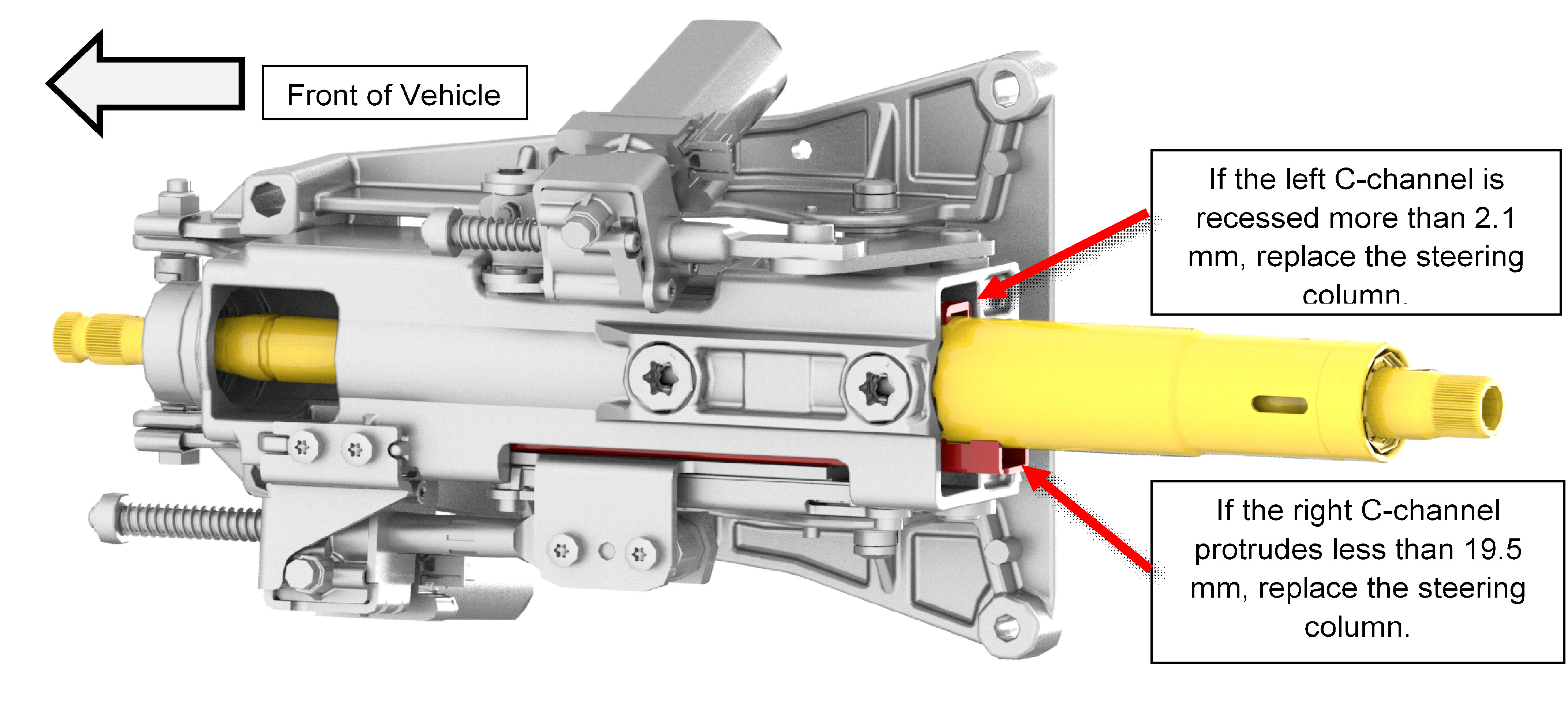 - For vehicles built after April 10, 2016: Adjust the steering column so that the column shaft (shown in yellow below) is fully retracted inside of the housing. Measure the C-channels (shown in red) on the side of the steering column. If the left C-channel is recessed more than 2.1 mm into the housing, or the right C-channel protrudes less than 19.5 mm from the housing, replace the steering column.
