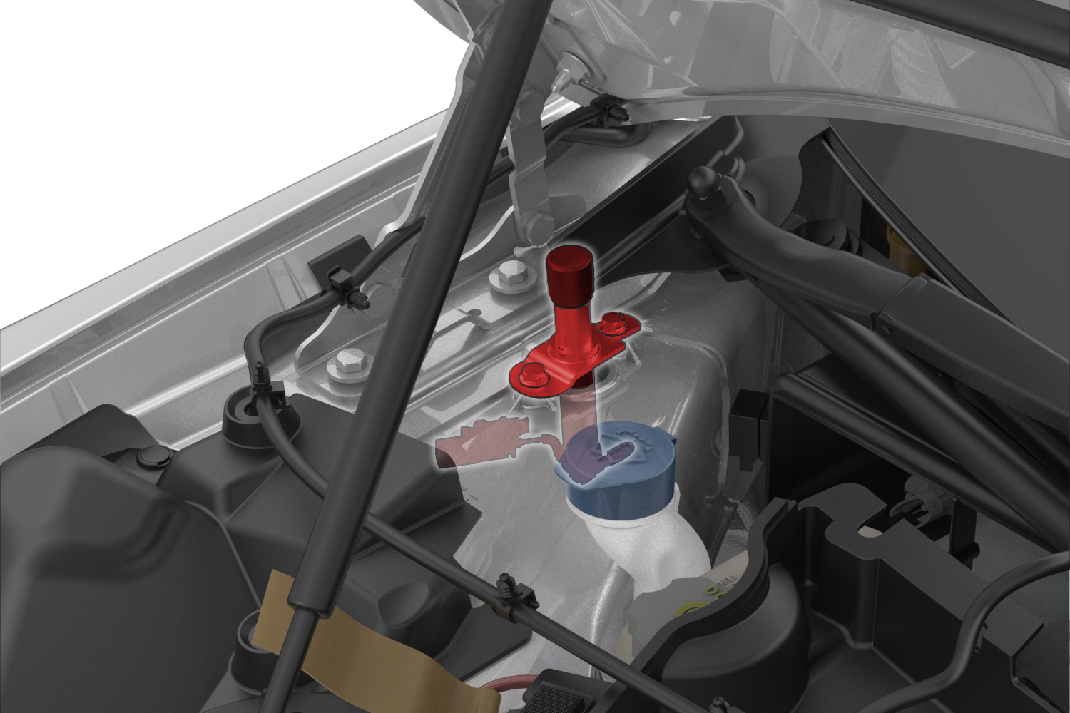 To determine if a vehicle is equipped with Pedestrian Protection components, open the hood and look for Pedestrian Protection hood actuators, as shown above.