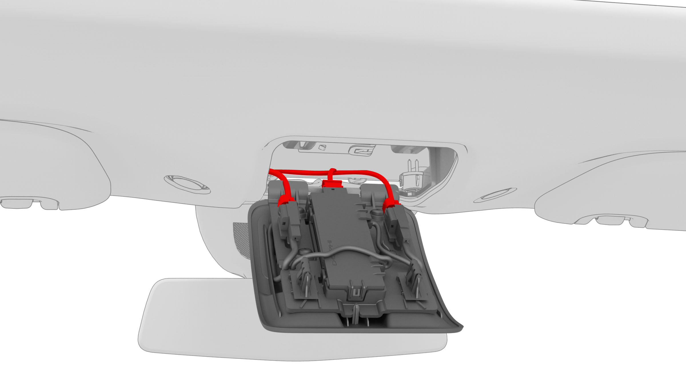 - Disconnect the headliner electrical harness from the microphone connectors (x2) and the intrusion sensor connector (if installed), and then remove the overhead console from the vehicle.