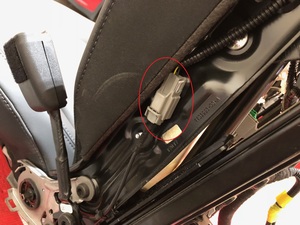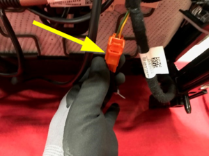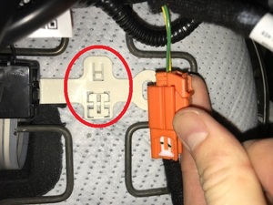 Note1x connector, 1x clip, Slide connector towards front of seat bottom to secure connector to clip
