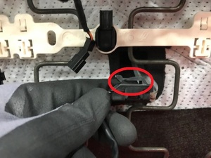 Note1x connector, 1x clip, Slide connector towards back of seat bottom to release connector from clip
