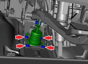 - Remove and discard the nuts (x4) that attach the pedal to the brake booster assembly (torque 23 Nm).