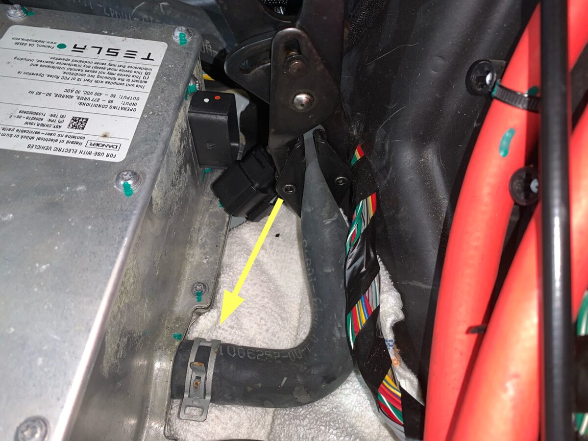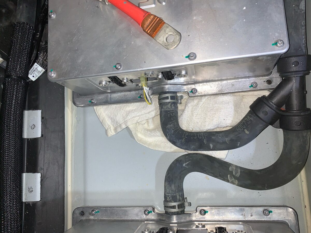 - Disconnect the coolant hoses from the slave charger assembly, and then and remove the slave charger assembly from the vehicle.