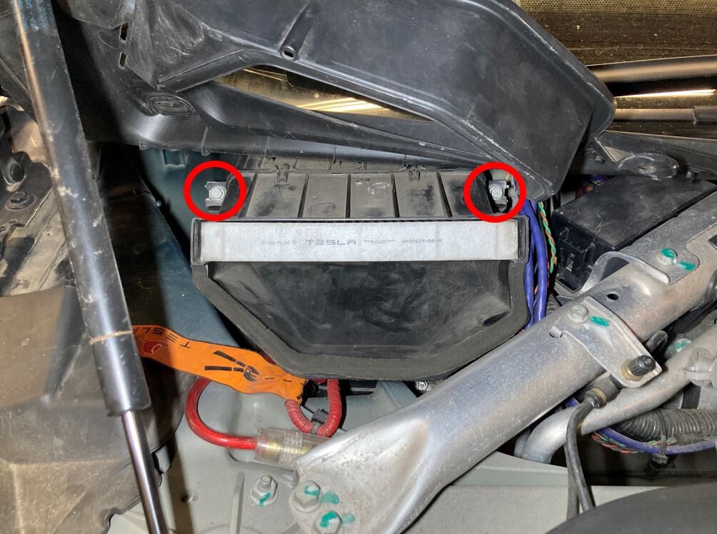 - Install the front HVAC filter housing, and then install the bolts (x2) that attach the filter housing (torque 1.5 Nm).