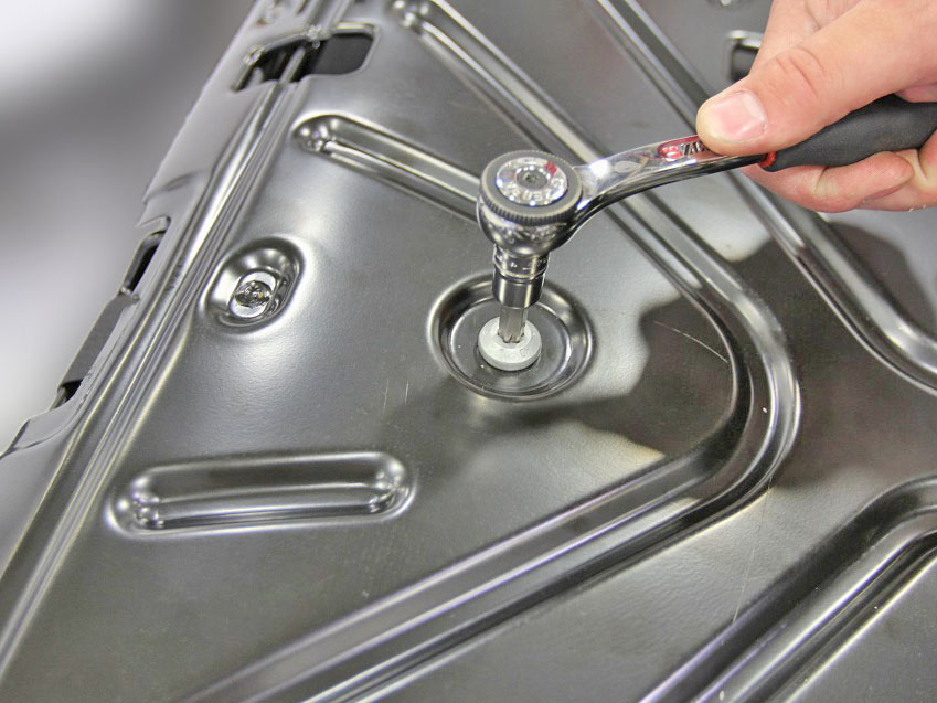 - Gently release the upholstery from the clips on the latch assembly.