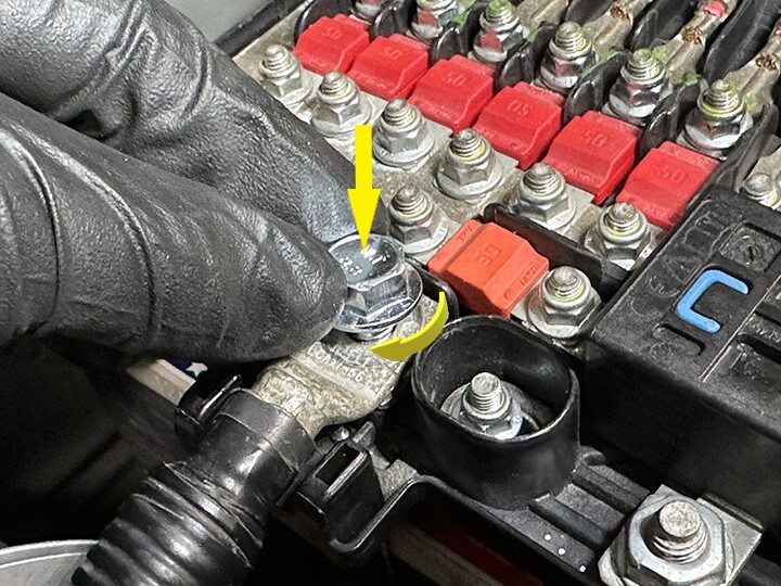 Torque nuts securing front harness lower wire terminals to 12V battery fuse box